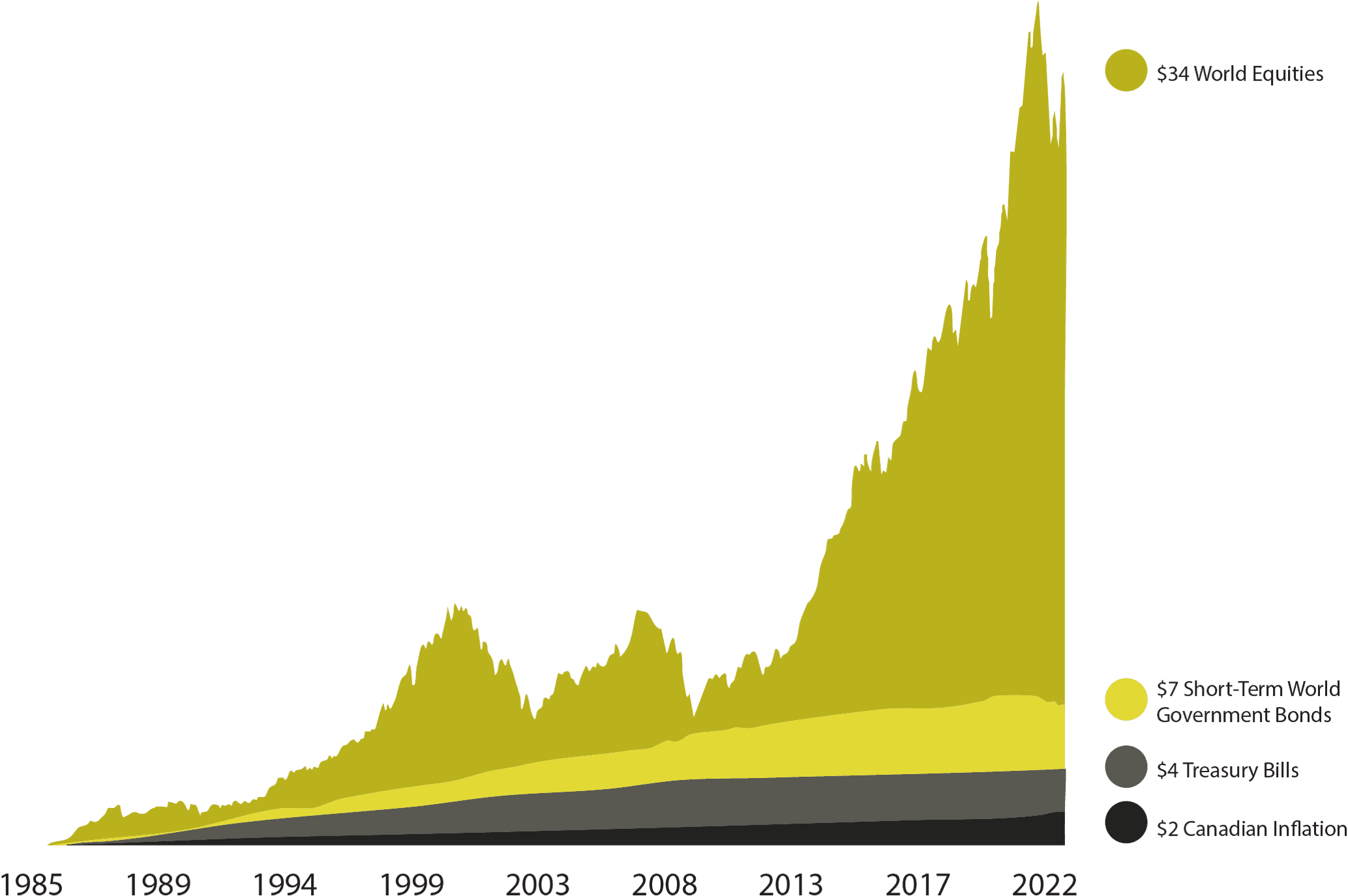 In CAD. World Equities is the MSCI World Index (gross dividends). Short-Term World Government Bonds is the FTSE World Government Bond Index 1–5 Years (hedged to CAD). Treasury Bills is the FTSE Canada 30-Day Treasury Bill Index. Canadian Inflation is measured as changes in the Canadian Consumer Price Index. MSCI data © MSCI 2023, all rights reserved. FTSE fixed income indices © 2023 by FTSE Fixed Income LLC. All rights reserved. Treasury Bills data provided by PC- Bond, a business unit of FTSE Global Debt Capital Markets Inc. All rights reserved. Canadian Inflation data is provided by the Bank of Canada. There is no guarantee investment strategies will be successful. Past performance is no guarantee of future results. Data presented in the Growth of a Dollar chart is hypothetical and assumes reinvestment of income and no transaction costs or taxes. The chart is for illustrative purposes only and is not indicative of any investment.